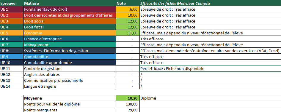 Téléchargez gratuitement ce fichier Excel pour calculer votre moyenne de DCG : saisissez vos notes par UE, voyez si vous êtes diplômé.